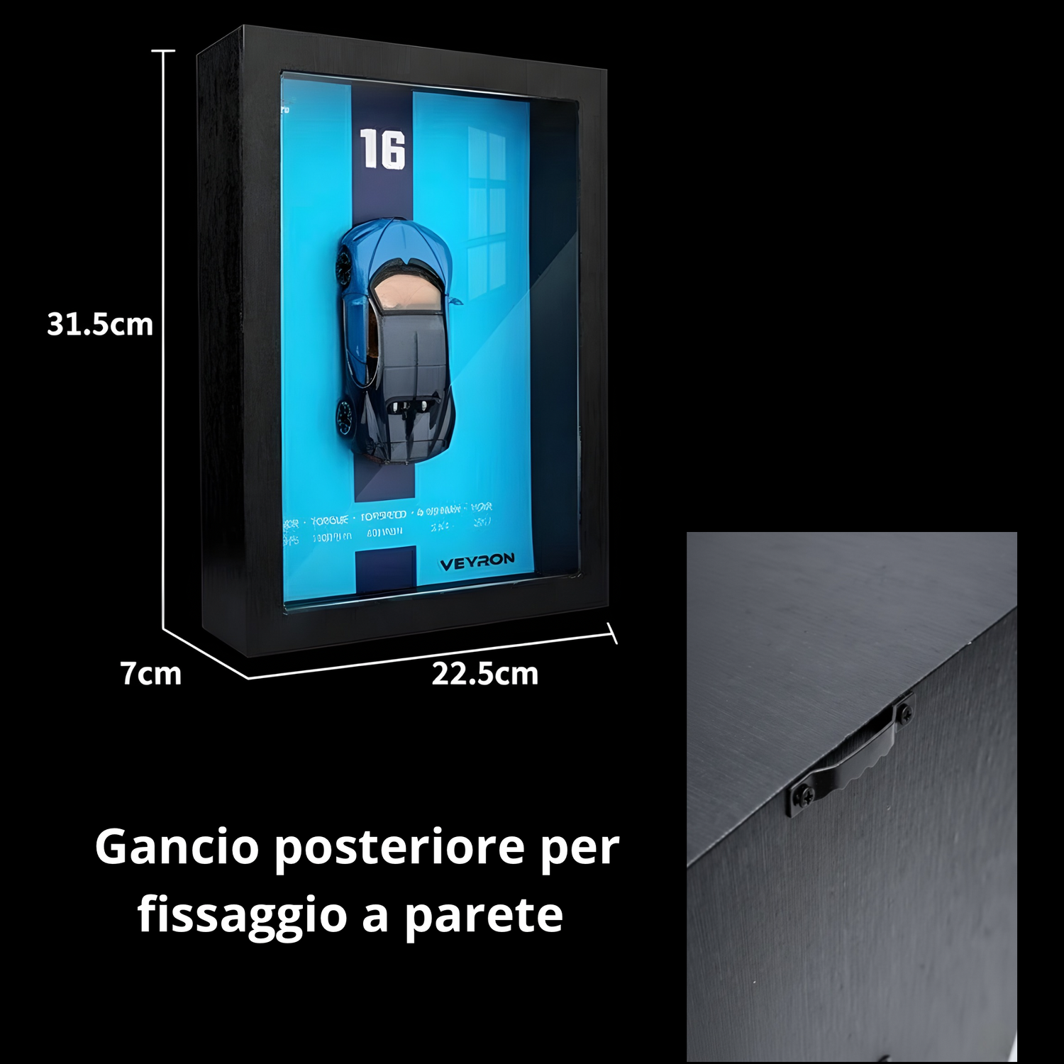 La cornice è studiata per essere appesa a parete, ma può anche essere inserita su una mensola o un ripiano se preferisci uno stile più “scultura”.